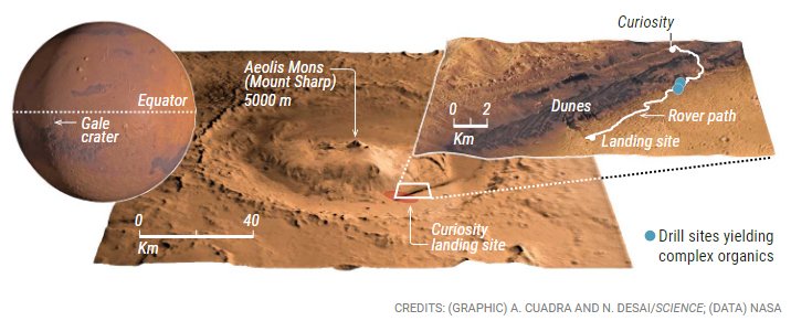 أعلنت وكالة ناسا عن اكتشافهم، لأول مرة في عام 2018م، عن جزيئات عضوية صلبة ومعقدة التركيب بعد فحص عينتين مختلفتين في منطقة يُعتقد أنها كانت بحيرة قبل أكثر من 3.5 مليار سنة! لم يحددّ الفريق العلمي -على الإطلاق- ما إذا كانت هذه الجزيئات أثراً لحياة سابقة أو عملية كيميائية جيولوجية.